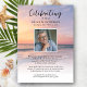 Honre a su ser querido con esta hermosa invitación de celebración de la vida. La portada presenta la foto de su ser querido en un escenario marino - tan pacífico y tranquilo. (Cambie esta gran foto de fondo del océano por una de las suyas.) Agregue fácilmente los detalles de su servicio de celebración. El reverso también ofrece espacio para una foto y un poema o escritura (o elimine). La plantilla es muy simple de usar y cambiar - cree una invitación que sea única y hermosa y que sea apreciada por siempre.