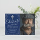 Descubre la elegante dignidad de nuestras invitaciones funerarias y conmemorativas personalizables. El fondo de azul marino profundo establece un tono contemplativo, delicadamente realzado por los acentos plateados brillantes. Una foto personal de su ser querido, junto con nuestra plantilla de texto personalizable, subrayará conmovedoramente la celebración de su vida. Su cruz religiosa simboliza la fe y la esperanza, presentando un tributo radiante al difunto. Personalice el color si lo desea: esta invitación es tan única como la persona que recuerda.