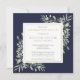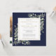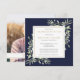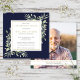 Una elegante invitación de recuerdo de celebración de la vida con agua personalizada de flora azul marino. Diseñada por Thisisnotme©