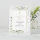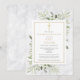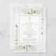 Una invitación elegante y personalizada de celebración de la vida en mármol con hojas de eucalipto y vegetación en acuarela. Diseñada por Thisisnotme©