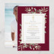 Una elegante invitación de recuerdo de celebración de la vida personalizada botánica con foto que presenta hojas de vegetación de acuarela sobre un fondo borgoña. Diseñado por Thisisnotme©