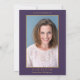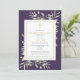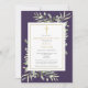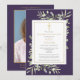 Una elegante invitación de funeral personalizada de celebración de vida con recuerdo de foto que presenta follaje botánico de acuarela sobre un fondo púrpura. Diseñado por Thisisnotme©
