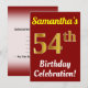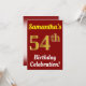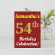Este diseño de invitación de fiesta de cumpleaños presenta un mensaje como "¡Celebración del cumpleaños número 54 de Samantha!", donde el nombre se puede personalizar, y donde el número "54" tiene una apariencia similar al oro falso. También presenta un fondo de color rojo. Los detalles del evento en el reverso se pueden personalizar. Podría utilizarse para invitar a la gente a la celebración del cumpleaños o fiesta de cumpleaños de alguien. [~Z0000120]