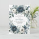 Un boda sofisticado con una corona floral de color azul marino adornada con peonías exuberantes, rosas y eucalipto verde en tonos azul marino, verde y marfil. El diseño se realza con una caja impresa de color gris plateado debajo de la corona con un diseño de texto de fuente moderno. La parte trasera de la invitación continúa con el tema con un arreglo floral a juego para un aspecto cohesivo y elegante. Perfecto para parejas que buscan una papelería boda atemporal y elegante.
