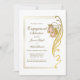 Una elegante invitación a la celebración del compromiso de oro con un marco dorado ornamentado con un adorno dorado con flores rosa rubor como parte del marco. El texto se personaliza fácilmente para que añada sus propios detalles según sea necesario.