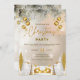 Diseño festivo con adornos dorados, árboles de Navidad blancos y regalos envueltos. El fondo cuenta con luces suaves, ramas de pino y estrellas doradas, creando un ambiente invernal cálido.