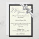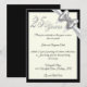 Invitación del 25 aniversario de bodas de plata. cuenta con el número 25 y años en plata, cinta blanca con un diamante incrustado en el medio y marco con borde de plata.