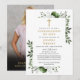 Esta elegante invitación de celebración de la vida y el recuerdo floral verde oliva se puede personalizar con su información en tipografía moderna y foto en el reverso. Diseñado por Thisisnotme©