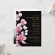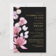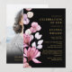 Esta invitación negra y dorada elegante de celebración de la vida y el recuerdo floral rosa se puede personalizar con su información en tipografía clásica y una foto del ser querido en el reverso. Diseñado por Thisisnotme©