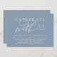 Marque el comienzo de su para siempre con elegancia utilizando nuestra tarjeta de invitación de celebración de baile de fiesta de brunch de almuerzo de cena de boda contemporánea con tema de azul polvoriento, "celebre con nosotros". Perfecta para parejas que extienden su alegre ocasión, esta invitación emana sofisticación con un toque de diversión, preparando el escenario para un evento memorable. Adornada con un tema de diseño de letra moderno y atemporal, añade un toque de encanto refinado a sus festividades. Creada por TeeshaDerrick, esta invitación promete capturar hermosamente su historia de amor.
