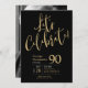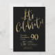 Esta fabulosa invitación para la fiesta de cumpleaños número 90 de hombres negros que dice "¡Vamos a celebrar!" en una fuente de escritura moderna en oro y la foto del invitado de honor en el reverso sería perfecta para celebrar el cumpleaños número 90 del hombre de tu vida. Esta invitación es tendencia, elegante, moderna y contemporánea. Para ver tus invitaciones personalizadas, selecciona "Personaliza esta plantilla", carga tu foto favorita (la plantilla la convertirá en blanco y negro) y escribe tu información. ¡Es súper fácil!