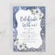 Faux brillan plata y marco azul purpurina y "¡Celebrad con nosotros! " con floral azul y blanco polvoriento, elegante y elegante. Ideal para la fiesta de boda romántica, la fiesta de compromiso, el fiesta de renovación de promesa u otros eventos de celebración. Vea todas las piezas coincidentes de la colección.