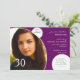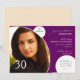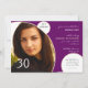 Este moderno y divertido diseño es perfecto para su invitación a la fiesta de cumpleaños. Su foto favorita sin duda destacará del resto en esta elegante y moderna tarjeta de invitación fotográfica. El fondo es morado con círculos blancos reseñados con champán. Tu foto crea el foco principal de tu invitación con tu texto a la derecha. Si quieres este diseño en otro esquema de colores, por favor contacta conmigo a través del enlace en mi primera página o búscalo en Pluma y Champaña, Amarillo y Verde, Rosa y Negro, Negro y Rosa, Negro y Blanco, Púrpura y Blanco, y Marrón y Azul Periwinkle. Esto está configurado para cumplir 30 años, pero todo el texto es personalizable para cualquier edad.