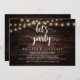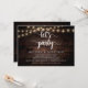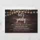 Celebremos la fiesta, tarjeta de anuncio / invitación de boda y fuga, con diseño de luces de cuerda y madera de granja rústica. Esto es perfecto para la recepción de su boda y la fiesta de celebración después de la boda. Agregue sus detalles en letra / letra coincidente.