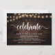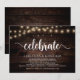 Celebremos, Tarjeta de anuncio / invitación de fuga de boda, en diseño de luces de cuerda de granja rústica de madera. Esto es perfecto para su recepción de boda y fiesta de celebración después de la boda. Agregue sus detalles en letra / tipografía coincidente.