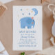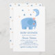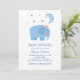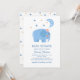 Cálida ducha dulce Invitación con elefante y luna divertidos, estrellas de color azul pastel.