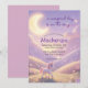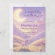 This custom birthday party invitation feature a magical celestial unicorn theme. An enchanting image of a meadow is featured in the background, with a sweet little unicorn walking among the flowers. A crescent moons shines in the dreamy sky above, along with tiny glowing stars. Glitter sparkles accent the scene. It's the perfect, enchanted invite for a little girl's birthday party.