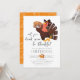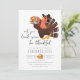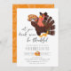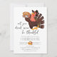 Esta moderna invitación al Día de Acción de Gracias de Friendsbaño incluye un bonito pavo acuático con un ilustracion de pastel y el dicho "Come Pie, Bebe Wine, Be Thankful", con un diseño elegante, sobre un sencillo fondo blanco. Es la manera perfecta de invitar a sus amigos a una divertida y festiva celebración del Día de Acción de Gracias.