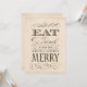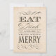 Elegante invitación personalizable con las palabras Come, bebe y sé Muy, Muy Feliz. Adecuada para aniversarios, cumpleaños, catas de vino, fiestas navideñas y muchas otras ocasiones.