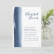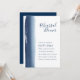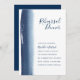 Cena moderna y creativa, con un diseño sencillo con una pincelada color azul marino a la izquierda sobre un fondo blanco. En la parte superior derecha está el título del evento en una letra manuscrita, en alineación a la derecha. En la parte inferior izquierda están los detalles del evento en una fuente sans serif, en la alineación izquierda. El reverso es un azul marino sólido. Este diseño único es ideal para una pareja artística.