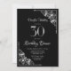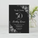 Invitación a la cena de 30 años en blanco y negro con esquinas diagonales de encaje ornamentadas para enmarcar el texto blanco.