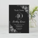 Una invitación a cenar en blanco y negro por 40 años con esquinas diagonales de encaje ornamentadas para enmarcar el texto blanco.