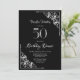 Invitación a la cena de 50 años en blanco y negro con esquinas diagonales de encaje ornamentadas para enmarcar el texto blanco.