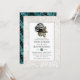 Invitación a la cena con un ensayo gótico con un cráneo decorado con rosas y plumas y un fondo de encaje con un verde azulado y negro damasco al revés.