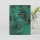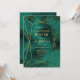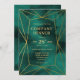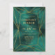 Invitación moderna y elegante, con líneas geométricas de joyas doradas con un fondo de color de agua esmeralda.