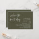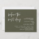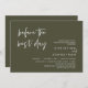 Anuncie su gusto después con estilo con nuestro moderno diseño de temática verde oliva (antes del mejor día) boda de la carta de invitación a la celebración del ensayo. Es ideal para las parejas que han decidido celebrar la noche anterior a su gran día. Con un diseño sofisticado pero lúdico, esta invitación seguramente marcará el tono para un evento inolvidable. La tarjeta de invitación incluye un moderno diseño de escritura romántico, añadiendo un toque de elegancia eterna a tu celebración. Diseñado por TeeshaDerrick