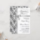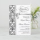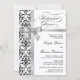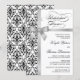 © 2013 Socialite Designs. Nuestra elegante invitación para el ensayo de damasco negro tiene un diseño falso de lazo de plata y arco. Todos los elementos de diseño y texto son personalizable. Si necesita productos bodas adicionales que coincidan, como guardar la fecha o tarjetas de fotos de agradecimiento, no dude en ponerse en contacto con los Diseños de Socialite. POR FAVOR, TENGA EN CUENTA QUE EL RIBBON ES UNA IMAGEN IMPRESA EN LA INVITACIÓN.