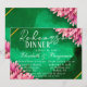 Un delicado ilustracion de acuarela con un marco geométrico dorado sobre un fondo verde esmeralda. El marco está adornado con crisantemos vivos de color rosa intenso colocados a lo largo de los bordes exteriores. Todo el diseño tiene una suave textura de acuarela, mezclando elegancia con un toque floral natural.