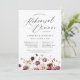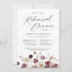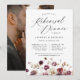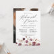 Las invitaciones para la cena de ensayo de la boda rústica de otoño presentan un prado de flores rústicas de acuarela y follaje que alinean la parte inferior del diseño en tonos de marsala, burgundy, púrpura, marrón y naranja oxidado. El prado floral de otoño se complementa con un elegante guión de caligrafía que da un aspecto cálido y romántico al diseño. Personalice las invitaciones para la cena de ensayo de otoño con sus nombres, detalles de la cena de ensayo y foto de compromiso vertical. El diseño coordina con nuestra colección de boda Floral de Otoño Rústico.