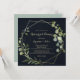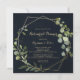Esta invitación geométrica a la cena, de color azul dorado, es perfecta para un día sencillo antes de que la familia boda y sus amigos se reúnan para cenar. El diseño está decorado con hermosas hojas verdes pintadas a mano en un fondo azul oscuro, adornando un marco geométrico dorado.