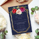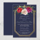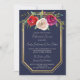 Una magnífica cena con un marco dorado con un fondo azul marino. Flores de color burdeos, rojo, ciruela y crema rosa. Por favor, contáctame si quieres ayudar a personalizar esta invitación a la cena de ensayo.