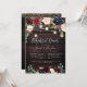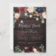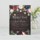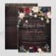 Cena de ensayo rústica frascos de Mason, cuerdas de luces. Con paneles de madera rústica oscura, flores de acuarela en burgundy bohemio y rosa y rosas navy. Acompañado de una invitación de boda con letra manuscrita en oro falso elegante y moderno (con filtro plateado). Color de fondo DIY.