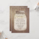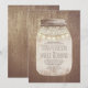 La invitación a la cena, un ensayo rústico, incluye tarro de albañil vintage con encaje a la antigua y un hilo de luces. Madera romántica y angustiada invitan a su rústica cena de ensayo en granero.