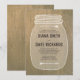 Cena rústica y acogedora de un jarrón de albañil invita a que se adapte a la temática del boda del granero. Ideal invitan a un estilo tipográfico y casual, con una tipografía moderna y un dibujo de tarros de bonito con flechas de amor dibujadas a mano. Fondo natural de textura de madera.