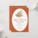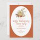 Una invitación para la Cena de la Fiesta de Acción de Gracias diseñada con hojas de color otoñal y una calabaza de acuarela, sobre un fondo naranja brillante y blanco con texto de invitación: Fecha, Hora y detalles de confirmación de asistencia. El reverso en color naranja de cosecha a juego. Para personalizar, simplemente reemplace el texto de muestra utilizando nuestra plantilla paso a paso.