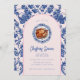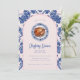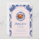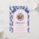 La invitación a cenar a los Navidades tiene un diseño grandilocuente con un pavo en un plato Chinoiserie azul y blanco y una frontera arcada azul marino y rosa brillante alrededor del borde. La parte delantera y la trasera tienen un patrón de damasco de coordinación.