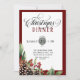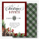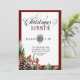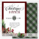 Invitación a la cena de Navidades de guiones. Navidades es un elemento de diseño de guiones y el marco de fecha circular tiene dos tonos verdes del lado posterior del patrón de Gingham. Las formas hacen que esta invitación sea orgánica y fluida. Marco rojo burdeos y una decoración acuarela de bayas, plantas verdes y pinos en la esquina inferior. La parte trasera tiene un patrón de gingham verde. Mantengan viva la tradición de la cena de sus Navidades e impresionen a la familia y a los invitados con estos elementos. Vea los demás productos coincidentes de esta colección para ver un tema cohesivo.