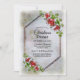 Una elegante invitación a cenar Navidades con un borde geométrico y flores rojas.