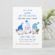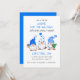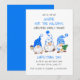 Invitación a la cena de Navidades guapos, divertidos y extravagantes con 3 gnomos adorables con gorras azules. El texto dice, "Únete a nosotros para nuestra cena familiar de Navidad". Personalizar añadiendo el año. Una cena adorable e informal para la familia a la que le encanta divertirse.