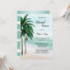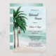 Invitación a una cena tropical de bodas en la playa o destino con palmeras con loros, una linterna y una estrella de mar con vistas a un océano turquesa.
