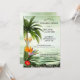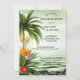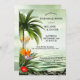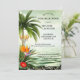 Playa tropical bohemia o destino de boda, invitación a cenar con palmeras con farolillos festivos y flores exóticas con vistas a un océano verde turquesa.