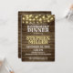 Invitación a la fiesta de jubilación con estilo de fuente de señalización occidental y aspecto de madera decorado con luces festivas. Esta invitación para cena de ensayo de madera de granero rústico campestre tiene texto y fuentes completamente editables, perfecta para fiestas de jubilación corporativas o familiares.