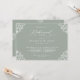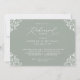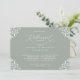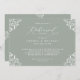 Estas elegantes invitaciones a los bodas de color verde sabio son perfectas para un boda elegante y sofisticado. El diseño de color verde sabio presenta un marco ornamentado vintage combinado con caligrafía elegante y texto clásico. La parte de atrás tiene las iniciales de la pareja junto con una línea organizada para honrar a los anfitriones de la cena del ensayo (esto se puede borrar si no lo quieres).