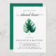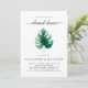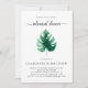Diseño de invitaciones a la cena de ensayo tropical con ilustracion de hojas de monastera verde acuarela sobre un sencillo fondo blanco. El lado inverso de la invitación está en un color verde profundo.