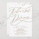 Este romántico ensayo de caligrafía dorada con invitación a la carta es perfecto para un simple ensayo boda. El moderno diseño clásico presenta vistosos remolinos y florituras con una preciosa y elegante tipografía de Relieve metalizado de oro con chaflán a mano con letras falsas y oro. Nota: Este diseño no tiene Relieve metalizado oro real. Es un gráfico de alta calidad hecho para parecer un Relieve metalizado dorado.