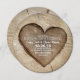 Único ensayo rústico-invitación a cenar con el viejo corazón de madera tallada en el árbol diseñado en forma de círculo. Ambos lados de la invitación tienen esta textura de madera afilada y antigua, es una foto hecha en el antiguo granero. Es perfecto, ¡una invitación increíble para tu cena de ensayo en el granero!
